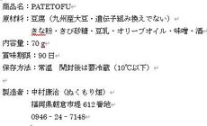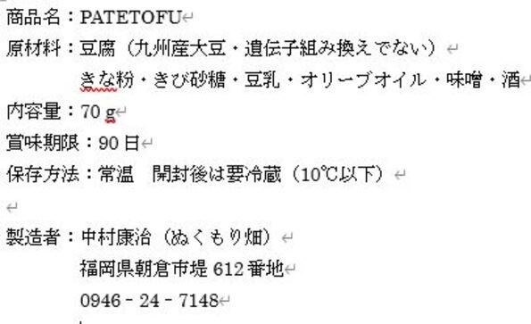 パンにぬる豆腐「PATETOFU」は「豆腐+味噌+きな粉+豆乳+オリーブオイル」をペースト状に混ぜ合わせ無添加で仕上げた一品です。 和風ピーナッツバターの様な味わい。 朝倉産ふくゆたか大豆を...