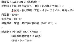 パンにぬる豆腐「PATETOFU」は「豆腐+味噌+きな粉+豆乳+オリーブオイル」をペースト状に混ぜ合わせ無添加で仕上げた一品です。 和風ピーナッツバターの様な味わい。 朝倉産ふくゆたか大豆を...