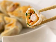 ぷりっぷりの海老が丸ごと一匹入ったえび水晶餃子。海老、肉、野菜の旨味がギュッと詰まっています。透明感のある皮で、焼いても蒸しても、美味しくお召し上がり頂けます。