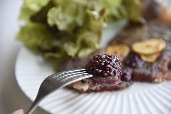 マスターネ。ブルーベリーはオードブルからメインのお料理、デザートまで使える珍しいフルーツがたっぷり入ったフルーティーなマスタード調味料です。 マスタードとブルーベリーの斬新な組み合わせはマスタ...