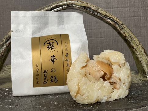 ブランド鶏「華味鳥」の鶏を柔らかく味付けし、大分県産の柚子胡椒を隠し味にして、牛蒡の炊き込みご飯の中に包み込んだ自慢の特選おむすび