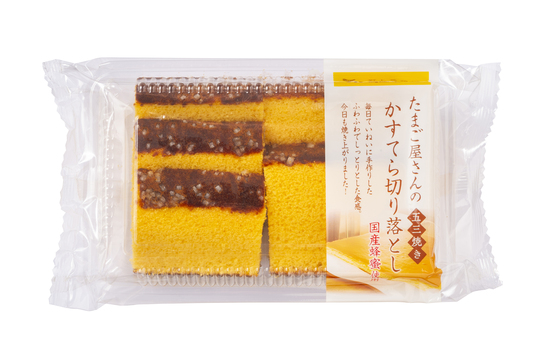純粋蜂蜜と濃厚たまごの上品なコク 養鶏場自家製の本格五三焼カステラです。 手に取りやすい切り落としパッケージにしました。