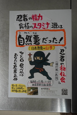 日本原産のヤマノイモ「自然薯」の専門の加工場です。すり鉢、すりこ木ですって、空気をいっぱい含んだふんわりしたすり立ての状態をそのまま冷凍することに成功して出来た「自然薯とろろ商品」(農商工連携事業に認定)の他、卵・牛乳不使用の自然薯古代プリン、砂糖不使用の自然薯生甘酒、自然薯古代かすてら、忍者食に自然薯が使われていた秘話から生まれた秘伝食自然薯とろろ(常温品)などの商品があります。