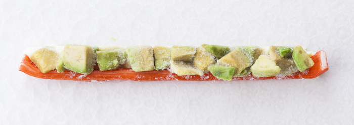 アボカドダイス、マヨネーズソース、カニカマで組み合わせた巻き芯です。サーモンや鮮魚を追加すると海鮮サラダ巻きずしになります。