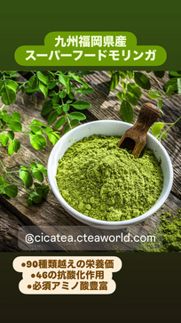 3代目が丁寧に栽培した九州福岡県産有機栽培日本茶と、九州福岡県産農薬不使用のモリンガ を種子から毎年栽培し、日本茶スペシャリストの資格を持つ代表がブレンドした身体に優しいcica tea シリーズを販売中です。また、今飲んでるコーヒーを身体に優しいモリンガ coffeeに変えたいとのお客様からの要望で今年はモリンガ coffeeをこの春から発売を開始しています。