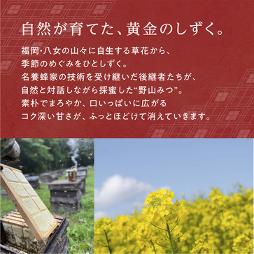 福岡県南部を中心にミツバチと共に名養蜂家青木勇彦とその弟子達が50年余年以上の技術と経験で採蜜してきた国産蜂蜜を製造販売しています。その中でも「巣みつ」は養蜂への技術と探究心で誕生した逸品です。また、極巣みつはその年採れた巣みつの中からさらに選び抜いた、香り、味、形、いずれも極上のものになります。大自然が生んだ究極の蜂蜜をご堪能ください。
