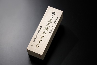 五三焼製法ならではのしっとりとした深く濃厚な味わいと、和三盆糖のすっきりとした甘さがお楽しみいただける一品です。 鶏卵は烏骨鶏卵を使用、焼き面表面に金粉を施しております。(桐箱入り) カステ...